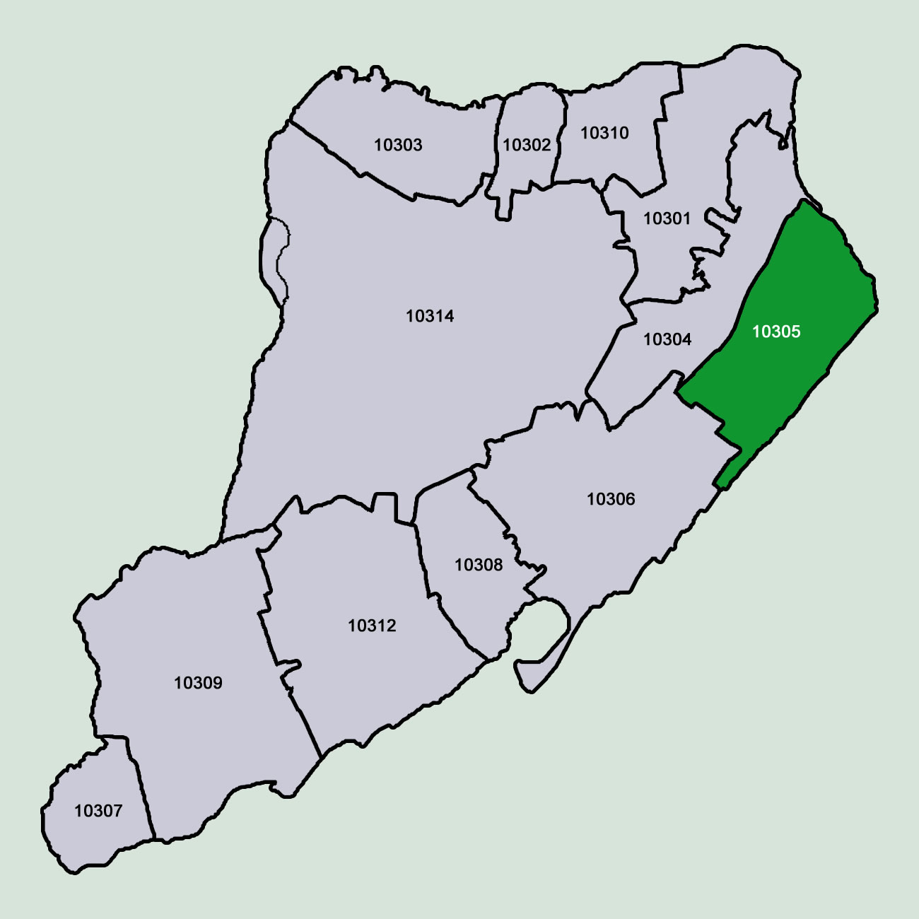 ZIP Code 10305 traces Staten Island’s East Shore waterfront, running from Rosebank and Fort Wadsworth south through Shore Acres, Arrochar, and South Beach.